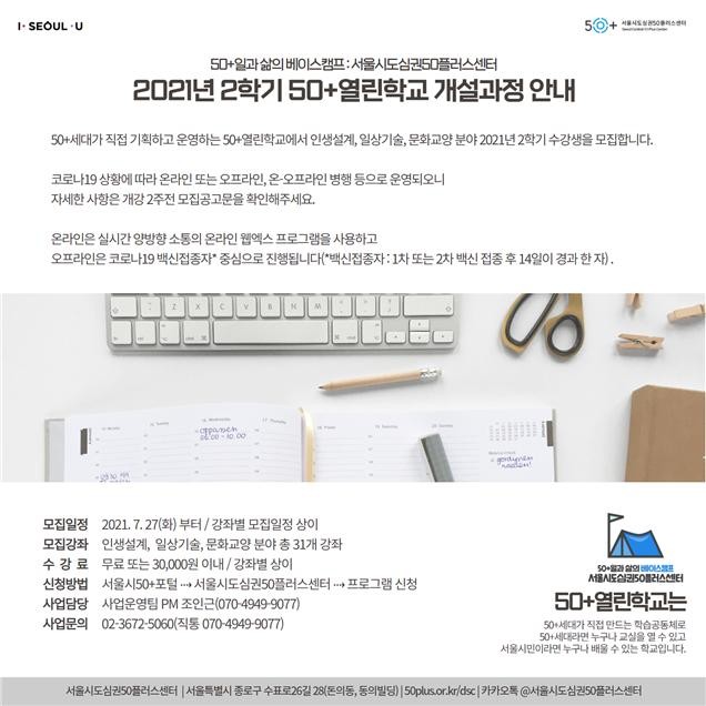 [세계로컬타임즈 이호 기자] 서울시50플러스센터는 경험과 경력이 풍부한 50+세대가 직접 기획하고 운영하는 50+열린학교 2학기 교육프로그램 수강생을 모집한다.