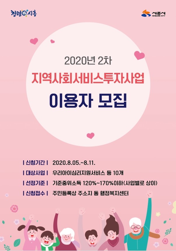 [세계로컬타임즈 장선영 기자] 시흥시는 2020년도 2차 지역사회서비스투자사업 바우처 이용자를 모집한다.