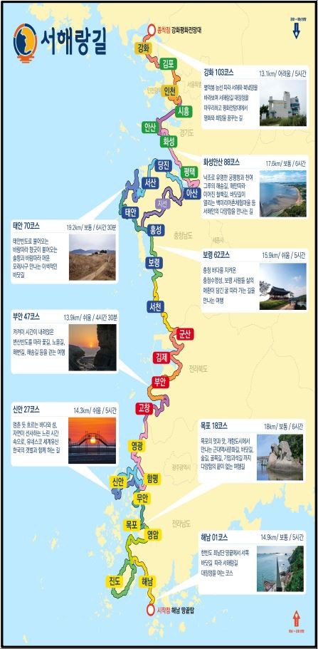 [세계로컬타임즈 이효진 기자] 문화체육관광부는 한국관광공사와 함께 오늘(22일) 전남 해남부터 인천 강화까지 서해안에 인접한 31개 기초자치단체의 109개 걷기길 약 1,800km 구간을 연결한 국내 최장 거리 걷기 여행길 ‘서해랑길’을 개통한다.