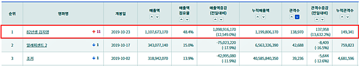 24일 제작·배급사 롯데엔터테인먼트에 따르면 영화진흥위원회 집계 결과 ‘82년생 김지영’은 개봉 첫 날인 전날 총 138,970명의 관객을 동원하며 박스오피스 1위에 올랐다.