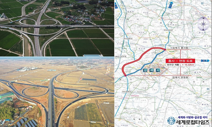 31일 김제시에 따르면 총 사업비 1544억 원이 투입, 2009년 6월에 착공한 김제시 연정동에서 흥사동을 잇는 국도대체우회도로 4차로 신설도로가 약 12년 6개월만에 완공돼 지난 28일 14시에 개통됐다.