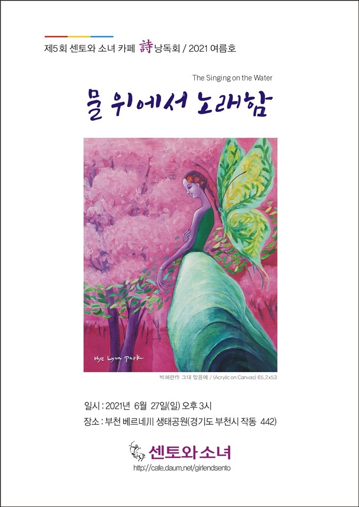 센토와 소녀는 6월 27일 오후 3시 경기 부천시 작동 베르네천 생태공원에서 ‘물 위에서 노래함’을 주제로 2021 여름 시 낭독회를 가졌다. 박정해 대표의 인사말과 운영진 소개로 시작된 이날 행사는 박해평 수필가의 축사, 센토 앙상블의 오프닝 연주(Let It Be Me · 서울의 찬가/ 만돌린 박정해, 팬플루트 김영란, 오카리나 박경순, 기타 최기만)로 문을 열었다.