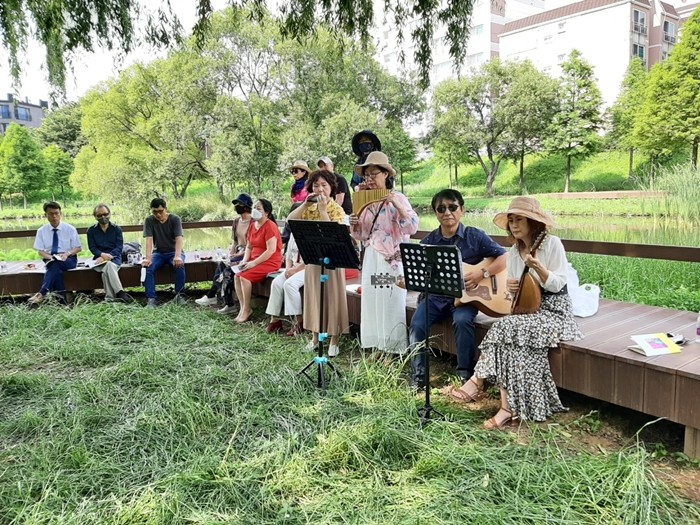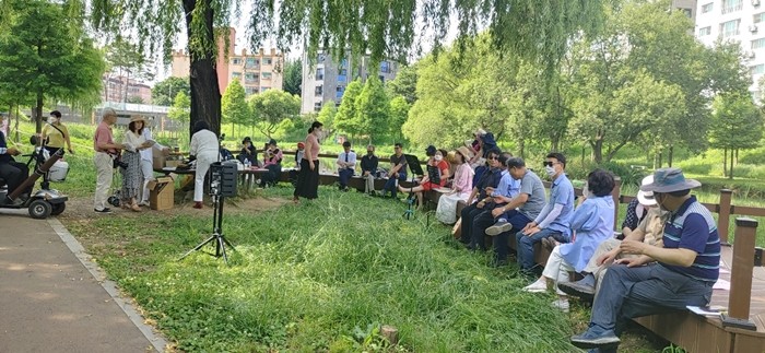 | ▲6월 27일 오후 경기 부천시 작동 베르네천 생태공원에서 열린 센토와 소녀 여름 시 낭독회에서 참가자들이 시낭독을 듣고 있다. |