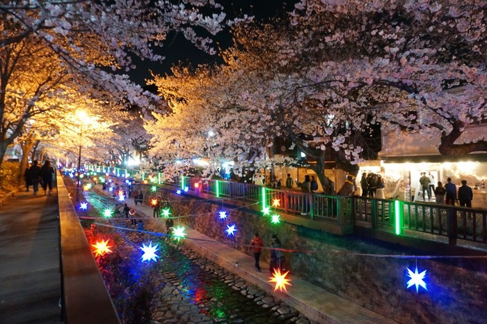 해가 져도 진해시가지는 밤 벚꽃놀이 인파로 북적이며 벚나무가 하천을 따라 들어선 여좌천 일대 850m는 벚꽃과 LED 조명이 어우러진 '별빛거리'로 탄생한다.