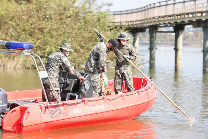 | ▲ 의왕시 해병대전우회에서 인면구조 보트로 수중 쓰레기를 수거하고 있다. (사진=의왕시 제공) |