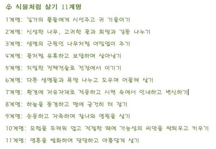이쯤 되면 식물처럼 살라는 저자의 말에 고개가 끄덕여지지 않는가? 책의 말미에는 식물처럼 살 수 있는 구체적인 방법으로 ‘식물처럼 살기 11계명’을 제시했다.