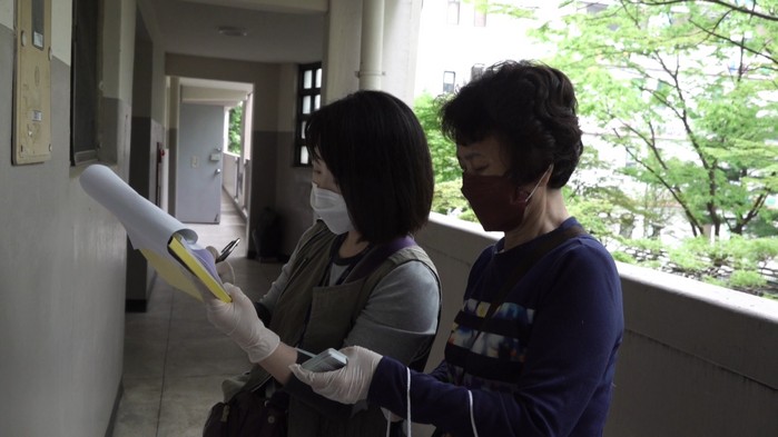 | ▲ 시청공무원과 지역 통장이 세대를 방문해 선불카드를 지급하기위해 거주자를 확인하고 있다. (사진=군포시 제공) |