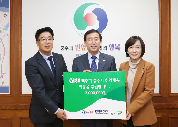 [세계로컬신문 온라인뉴스팀] OB맥주(주) 충주지점(지점장 김부영)이 26일 충주지역 소외계층 아동을 지원하는 민관협력사업비 300만원을 초록우산어린이재단에 기탁했다.