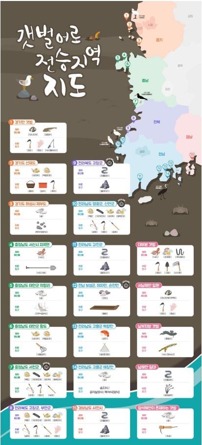 예를 들어, 펄갯벌의 뻘배(널배), 모래갯벌의 긁게·써개·갈퀴, 혼합갯벌의 호미·가래·쇠스랑, 자갈갯벌의 조새 등이 대표적이고 오랜 세월 전승되면서 같은 도구라도 지역별로 사용방법이 분화된 것이 특징이다.