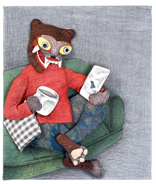 곽수경 작가의 ‘안부 인사’는 까치는 기쁜 소식을 전해주고 호랑이는 나쁜 기운을 막아준다는 민화를 현대적으로 해석한 섬유공예 작품이다.