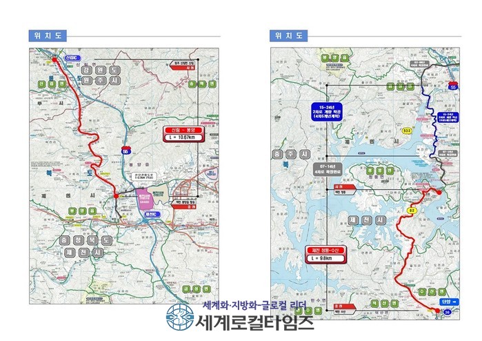 | ▲(좌)봉양-신림 4차선 위치도, (우) 수산-청풍 공사 위치도(사진=제천시) |