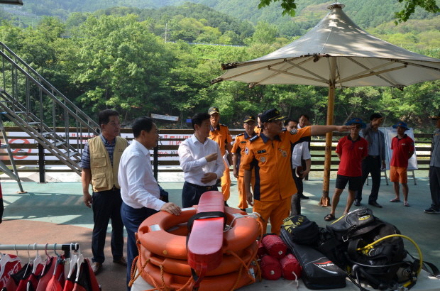 | ▲지난 5일 경기도 청평면 대성리 황새바위 유원지 산장국민관광지에서 김동근 행정2부지사(왼쪽 세번째)가 여름철 안전시설물 현장점검을 하고 있다. <사진제공=가평소방서> |