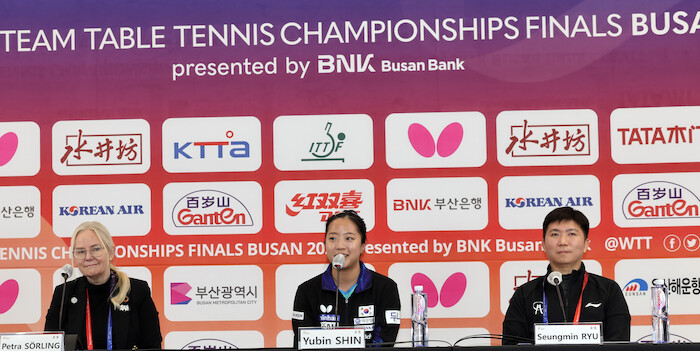 | ▲ 15일 부산 해운대구 벡스코에서 '2024부산세계탁구선수권대회' 미디어센터에서 페트라쇠링(사진 왼쪽) ITTF 회장, 한국 여자 탁구 대표팀 신유빈 선수, 류승민 조직위 공동위원장 등이 공식 기자회견을 갖고 있다. (사진=뉴시스) |