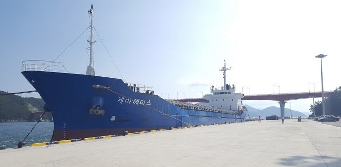 | ▲ ㈜제마해운이 운영할 4000톤급 화물선 제마에이스가 신마항에 정박한 모습.<사진제공=강진군> |
