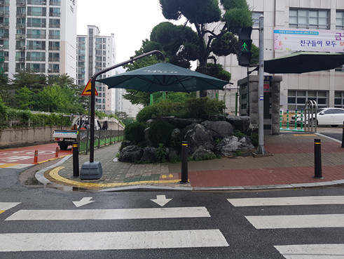 | ▲ 금정초등학교 후문 앞 횡단보도에 설치된 그늘막 모습. (사진=군포시청 제공) |