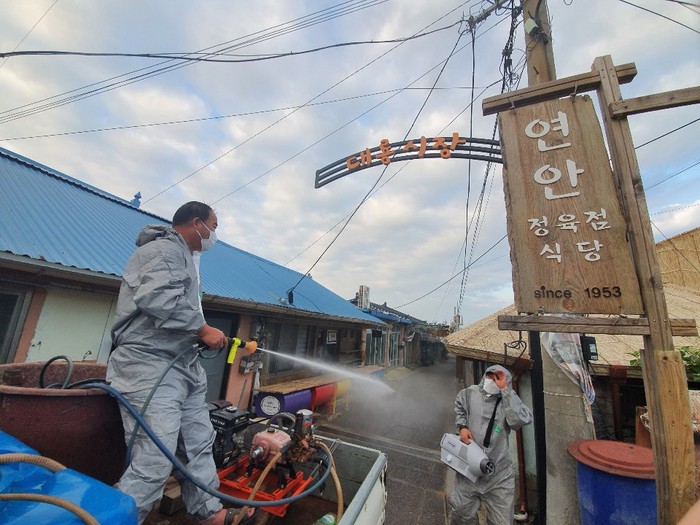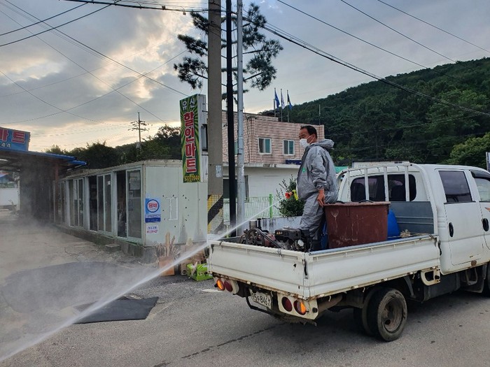 지난 25일 이장단은 방역에 필요한 보호장비를 착용하고 대룡시장 일원, 제비집 주차장, 버스정류장, 공중화장실 등 다중 이용시설의 방역을 실시했다.