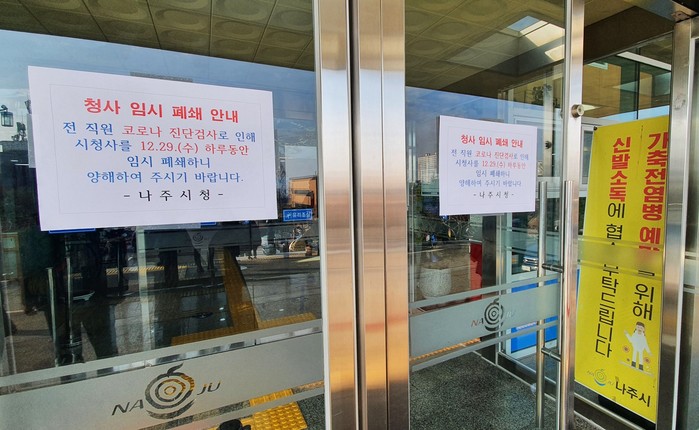 [세계로컬타임즈 강석운 기자] 전라남도 나주시가 29일 청내 직원 코로나19 감염에 따른 추가 확산 차단을 위해 이날 하루 청사 본청과 별관 건물을 임시 폐쇄한다.