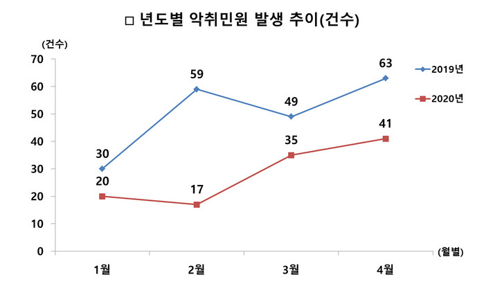 | ▲ 인천 서구 '연도별 악취민원 발생 추이' 그래프. (그래프=인천 서구 제공) |