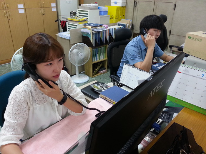 | ▲대전 대덕구 대화동 주민센터 관계자들이 중장년 독거세대와 통화하고 있다.<사진제공=대덕구청> |