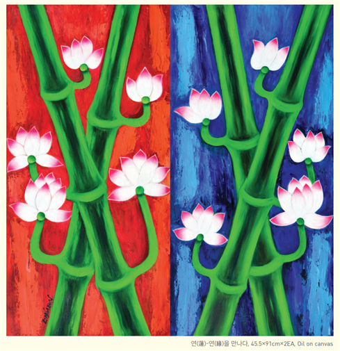 이어 “공자도 논어에서 설하셨고, 송나라때 선승 분양선사도 어록에서 시작을 알 수 없는 긴 세월 이어져온(무량겁래 無量劫來) 의심을 순식간에 그치게 되었으니(의정돈식 疑情頓息) 이 삶이 어찌 기쁘고 즐겁지 아니하겠는가 (기불경쾌평생 豈不慶快平生)라고 했다”면서 “하수상한 시절에 이번 전시는 상서롭고 행복하기를 염원하는 마음으로 오방색과 무지개를 형상화해 연(蓮)에 표현해 보았다”고 밝혔다.