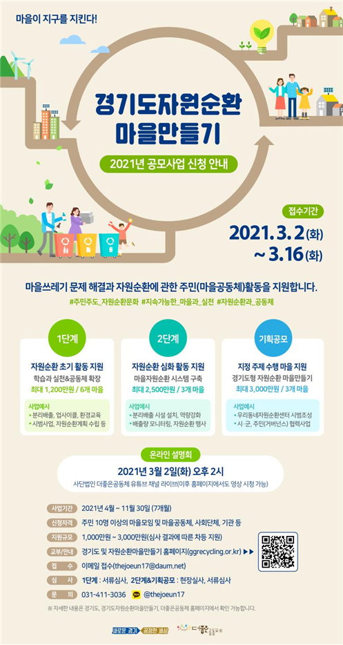경기도 관계자는 “이번 사업은 도민이 주체가 돼 마을 특성에 맞는 자원순환 시스템을 구축하고 나아가 도내 자원순환 문화 조성을 목표로 하고 있다”며 주민 공동체들의 참여를 당부했다.