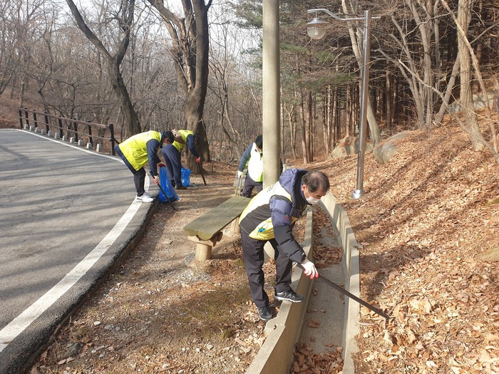 | ▲ 강화군 시설관리공단 직원들이 설 명절을 대비해 마니산 환경정화 활동을 펼치고 있다. (사진=강화군 제공) |