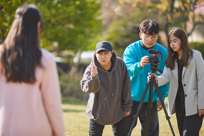 | ▲ 인하대 홍보 서포터즈 학생들이 웹 드라마 '인하운'을 제작하고 있다. (사진=인하대 제공) |