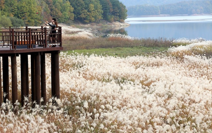 | ▲ 대청호 산책로에서 한 커플이 기념사진을 찍고 있다.<사진제공=대전시청> |