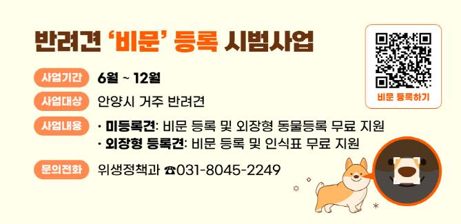 안양시에 거주하는 반려견은 누구나 무료로 비문 등록을 할 수 있다. 미등록견이라면 비문 등록과 함께 외장형 동물 등록을 할 수 있으며, 기존 외장형 등록견이라면 비문 등록 시 인식표를 지원받을 수 있다. 다만, 내장형 등록견은 비문 등록을 할 수 있지만 인식표 지원은 불가하다.