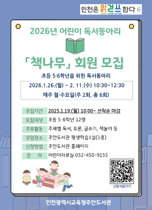 참여 신청은 1월 19일 오전 10시부터 선착순으로 주안도서관 누리집에서 가능하며, 자세한 내용은 도서관 누리집을 참고하거나 어린이자료실로 문의하면 된다.