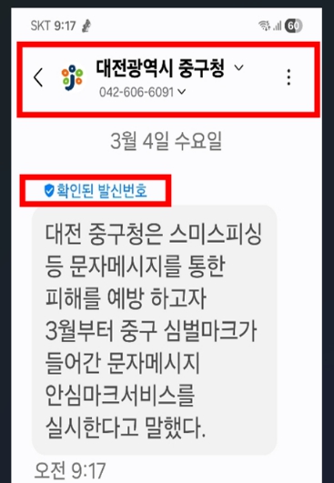 안심마크서비스(RCS, Rich Communication Services)는 구청에서 발송하는 문자메시지에 대전 중구의 공식 마크와 기관 명칭을 함께 표시해 발신처가 공공기관임을 인증하는 서비스다.