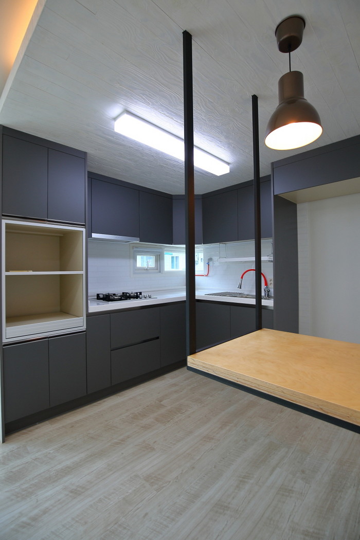 1층은 거실과 부엌, 다용도실을 만들어 공용공간으로 설계했다. 거실에는 픽스창을 둬 햇빛이 집 안으로 최대한 많이 들어올 수 있도록 했다. 부엌에는 무광택 그레이톤의 싱크대로 세련된 분위기를 연출했다. 좁은 집을 넓게 쓰기 위한 갖가지 아이디어가 돋보인다. 천장에 매달린 형태의 식탁을 자체 제작해 공간을 넓어보이게끔 꾸몄고 계단 밑과 현관 옆 신발장 뒤 공간을 간이 창고로 만들었다. 또 소파 대신 낮은 수납형 의자를 설치하고 계단 하부에 수납공간을 뒀다.