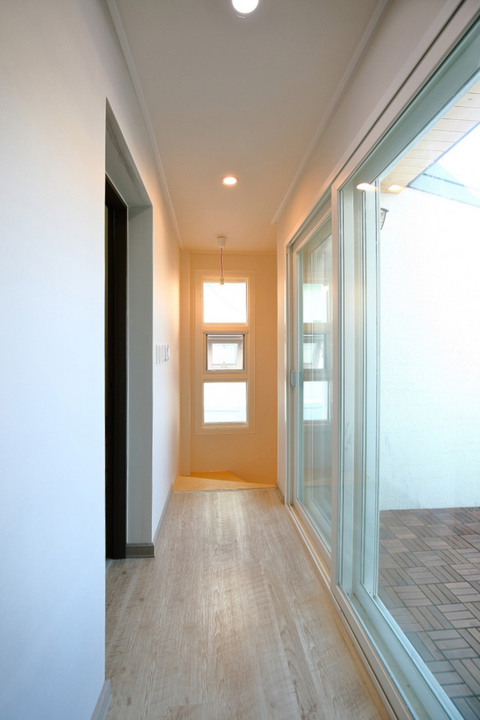 개인공간인 2층에 놓인 아이방에는 복층 벙커침대를 만들어 공간을 위아래로 분리하고 외부에서는 보이지 않게끔 만든 중정형 테라스를 부부침실 옆에 만들어 티 타임을 즐길 수 있게 했다. 마당에는 접으면 주차가 가능하고 닫으면 마당으로 쓸 수 있는 6m 가까운 3단 접이문을 설치해 마당을 다양하게 활용할 수 있도록 했다.