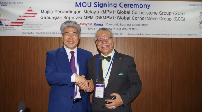 | ▲ 강성태 한국 글로벌코너스톤그룹 회장(왼쪽)과 다토 하싼 빈 매드 말레이시아 MPM 회장이 MOU 체결 후 악수를 하고 있다. |