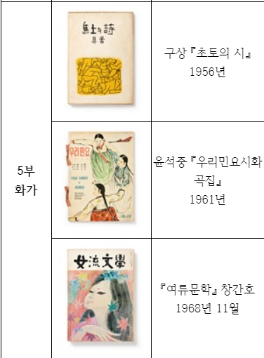 이중섭(종로구 누상동)이 표지를 그린 구상 '초토의 시', 박노수(종로구 옥인동)가 장정한 윤석중의 '우리민속시화곡집', 천경자 (종로구 옥인동)가 장정한 '여류문학' 창간호 등의 작품을 만나볼 수 있다.