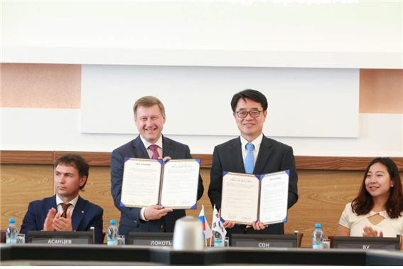 ▲ 지난 25일 송석두 대전시 행정부시장(오른쪽)이 러시아 노보시비르스크시 관계자와 '자매결연 체결 15주 년 기념 국제협력 강화협정'을 체결한 후 기념촬영하고 있다. <사진제공=대전시청> |