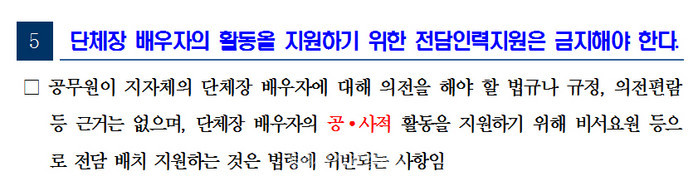 이 중 다섯번째 항목에는 '공무원이 지자체의 단체장 배우자에 대해 의전을 해야 할 법규나 규정, 의전편람 등 근거는 없으며, 단체장 배우자의 공적,사적 활동을 지원하기 위해 비서요원 등으로 전담 배치 지원하는 것은 법령에 위반되는 사항' 이라고 명시돼 있다.
