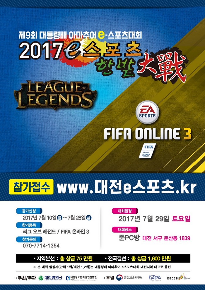 LOL 우승팀과 피파3 결승에 오른 2명은 오는 오는 8월 19일부터 20일까지 서울 마포구 상암동 e스포츠 전용경기장(S-PLEX)에서 펼쳐지는 ‘2017 대통령배 아마추어 e스포츠대회’에서 대전을 대표해 각 시도 대표들과 실력을 겨룬다.