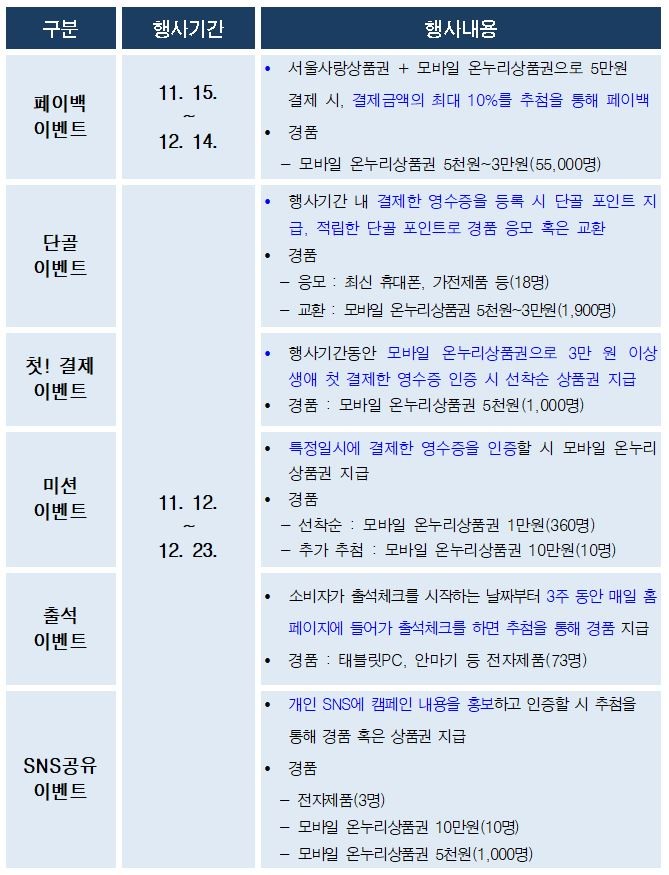 15일부터 12월 14일까지 한 달간 모바일 온누리상품권과 서울사랑상품권 합산 결제 금액이 5만 원이 넘을 경우 사용액의 최대 10%를 모바일 온누리상품권으로 돌려준다.