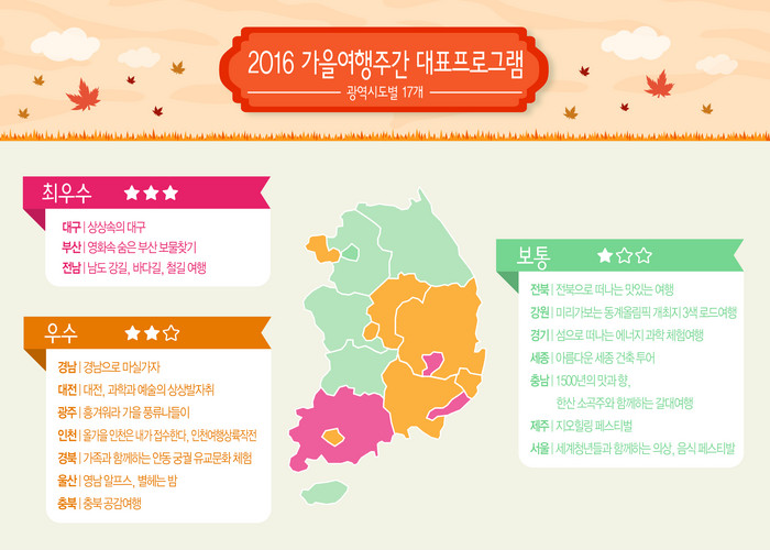 문화체육관광부(장관 조윤선, 이하 문체부)는 오는 24일부터 11월 6일까지 한국관광공사와 지방자치단체(이하 지자체), 공공기관, 민간기업 등이 함께 ‘숨겨진 대한민국이 열립니다’라는 주제로 ‘2016 가을 여행주간(이하 여행주간)’ 행사를 진행한다고 밝혔다.