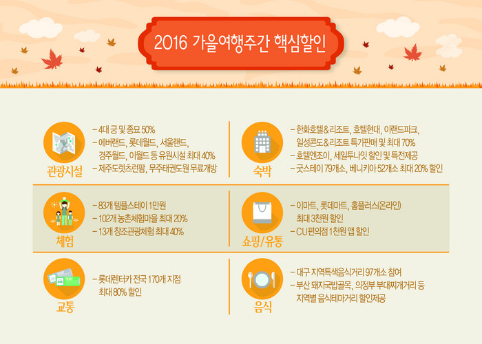 여행 비용 부담이 가장 큰 숙박 부문에서는 굿스테이(79개소)와 베니키아(52개소), 고택, 한화 리조트 등 전국 2087개의 업소가 할인에 참여했다. 호텔엔조이와 세일투나잇 등 온라인·모바일 전용 예약업체도 할인행사에 동참했다.