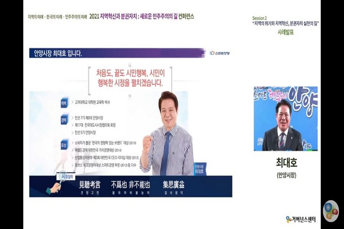 [세계로컬타임즈 장선영 기자] 최대호 안양시장이 ‘2021 지역혁신과 분권자치 콘퍼런스’에서 지역의 위기, 분권자치 실천의 해법으로 규제혁신을 제안했다.