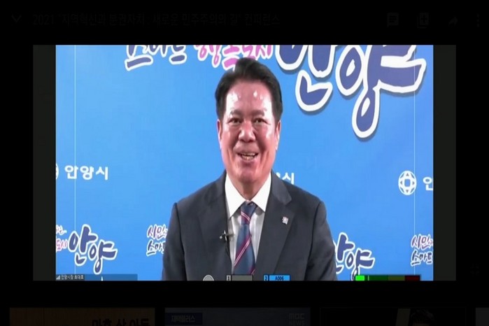 | ▲최대호 안양시장이 25일 온라인으로 ‘2021 지역혁신과 분권자치 콘퍼런스’에서 토론하고 있다.(사진=안양시) |