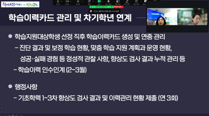 주요 내용은 ▲기초학력 보장 계획 및 예산 활용 점검 ▲학습 지원대상학생 지원협의회 운영 ▲지원 프로그램 미참여 학생 지원방안 ▲기초학력 보장 프로그램 운영 ▲성장기록 프로그램 활용 방법 등이다.