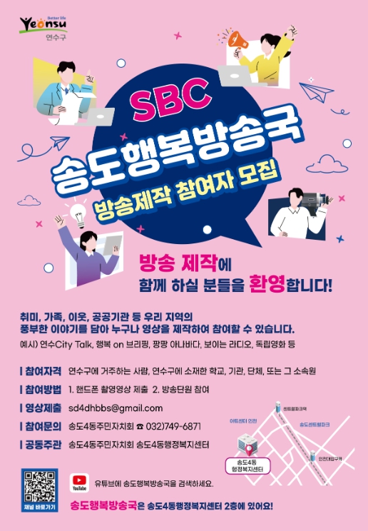 송도행복방송국은 주민들이 직접 참여해 연수구의 문화, 생활, 환경 등 다양한 주제를 다루고, 주민 간 소통을 촉진하여 공동체 의식을 강화하는 등 주민의 의견을 반영한 방송을 제작하는 주민 주도형 마을 방송국이다.