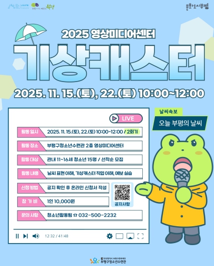 참여자 모집은 오는 30일까지 진행된다. 모집 인원은 부평 내 11~16세 청소년 15명이며, 참가비는 1인당 1만원이다.