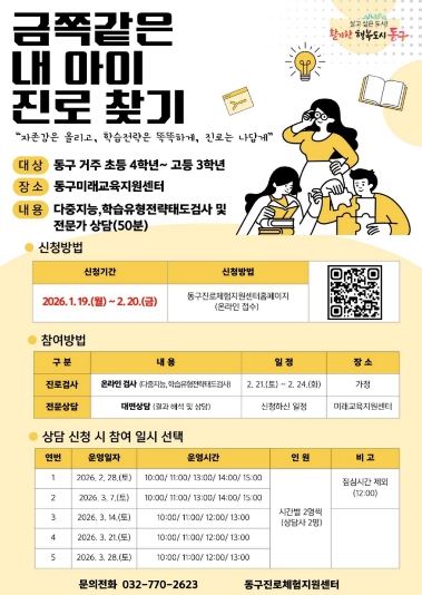 김찬진 동구청장은“이번 프로그램을 통해 학생들이 자신의 흥미와 역량에 맞는 진로를 찾고 자존감을 높이는 계기가 되길 바란다”며 “부모와 자녀가 서로를 이해하고 소통하며 긍정적인 학습전략을 세울 수 있도록 많은 관심과 참여를 부탁드린다”고 말했다.