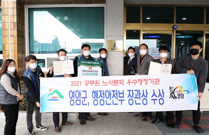 [세계로컬타임즈 강석운 기자] 영암군과 전국공무원노동조합 영암군지부가 행정안전부 주관 2021년 공무원 노사문화 우수행정기관 인증평가 시상식에서 ‘행정안전부장관상’을 수상했다.