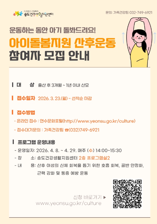 이번 프로그램은 산후 여성의 신체 회복을 돕기 위해 출산 후 3개월에서 1년 이내의 산모를 대상으로 하며, 전문 강사를 초빙해 안전하게 운영할 예정이다.