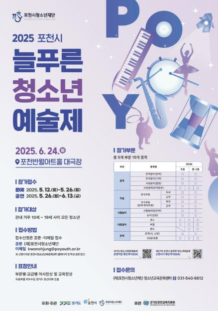 본선 무대는 6월 24일 포천반월아트홀 대극장에서 열리며, 음악, 무용, 사물놀이, 대중문화 부문 경연을 진행한다. ‘시, 산문’ 종목은 6월 10일, 올해 새롭게 신설한 ‘숏폼’ 종목은 5월 28일부터 6월 10일까지 작품을 출품하면 된다.